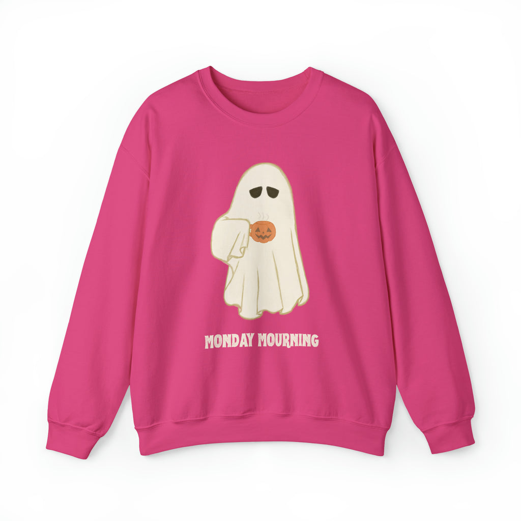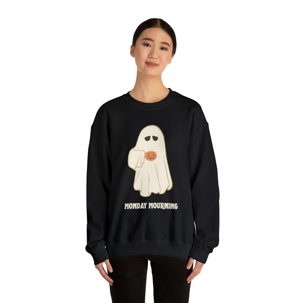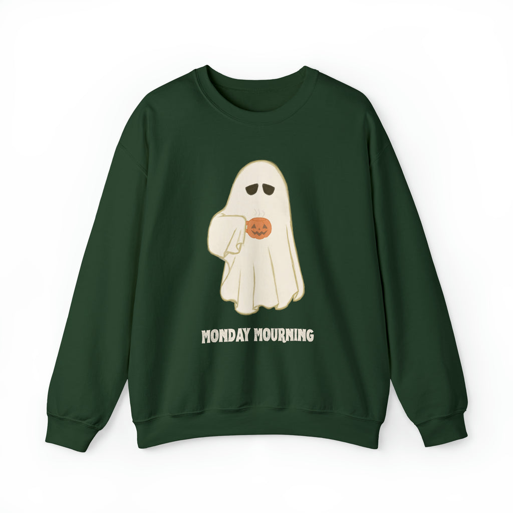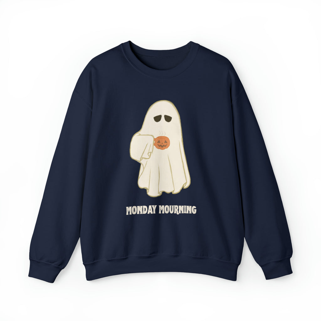A cozy sweatshirt featuring a cute grumpy ghost holding his coffee on a Monday morning.