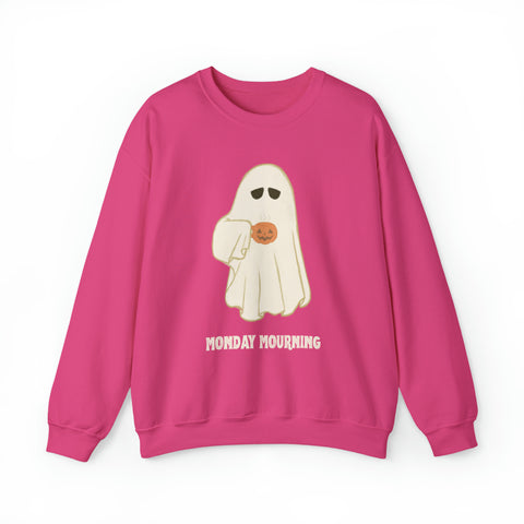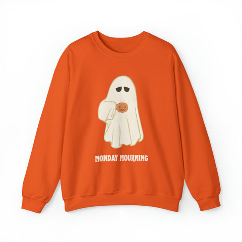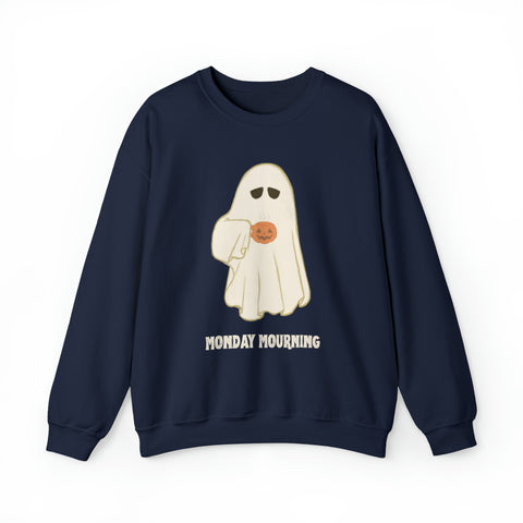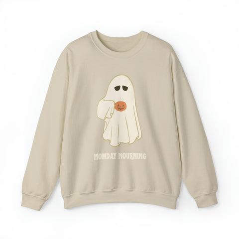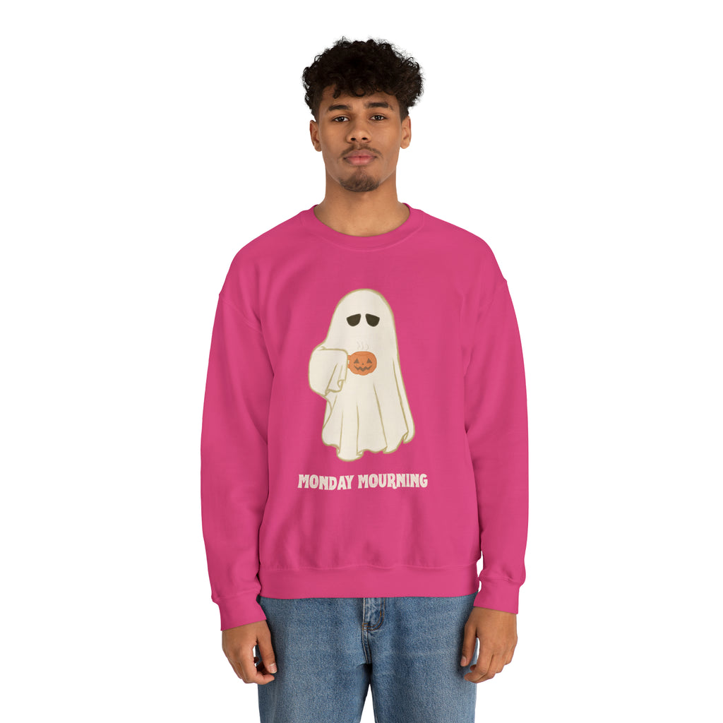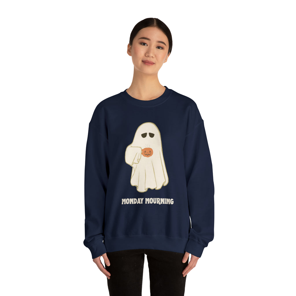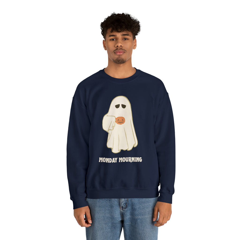 A cozy sweatshirt featuring a cute grumpy ghost holding his coffee on a Monday morning.