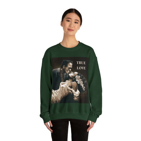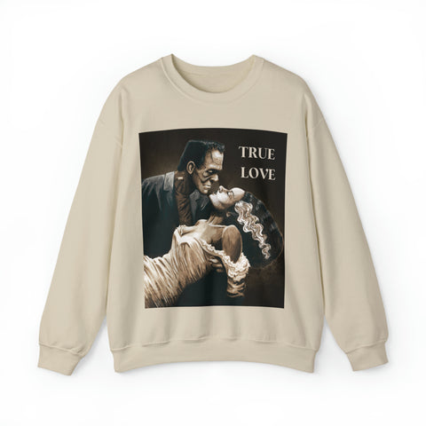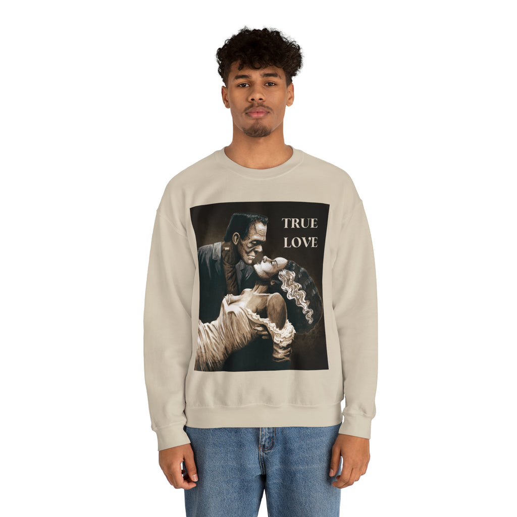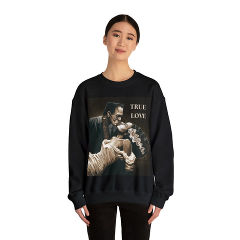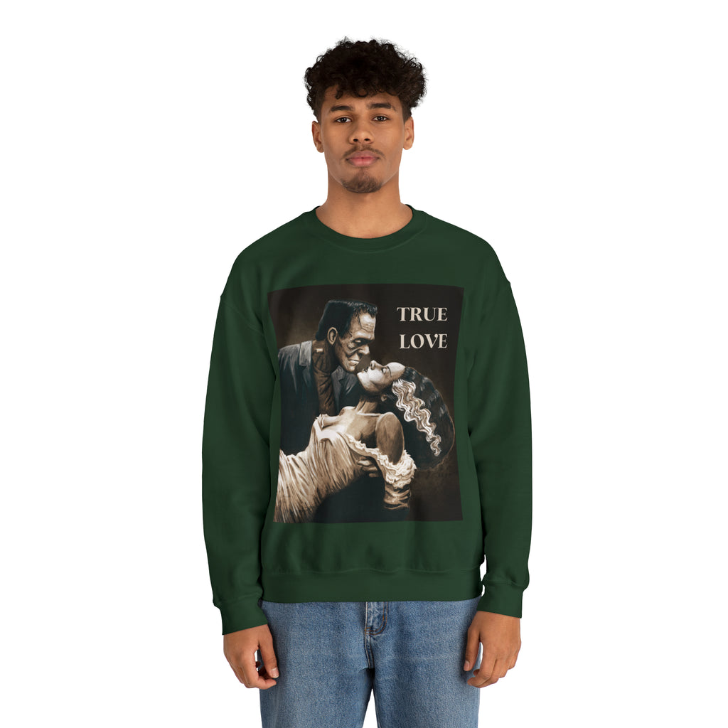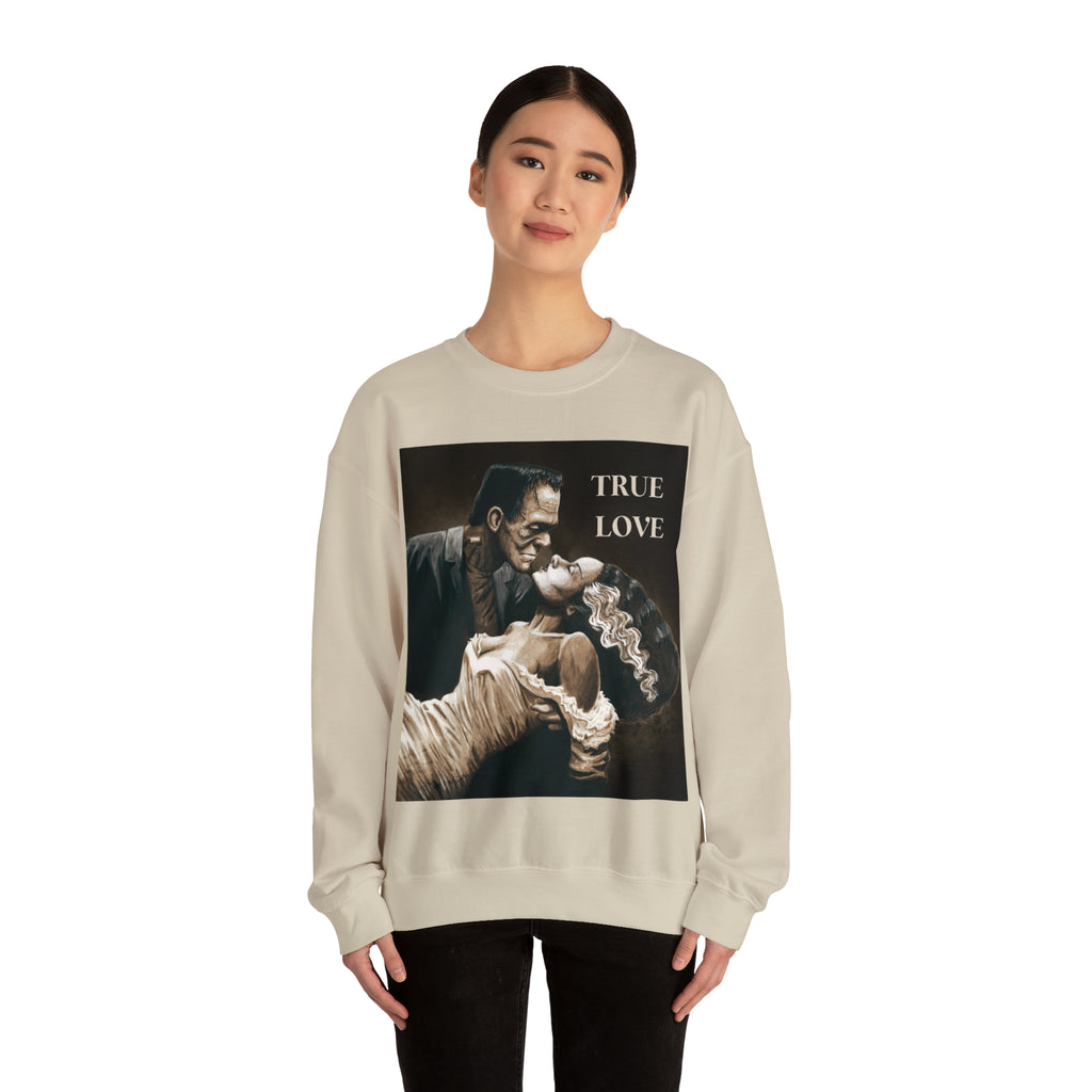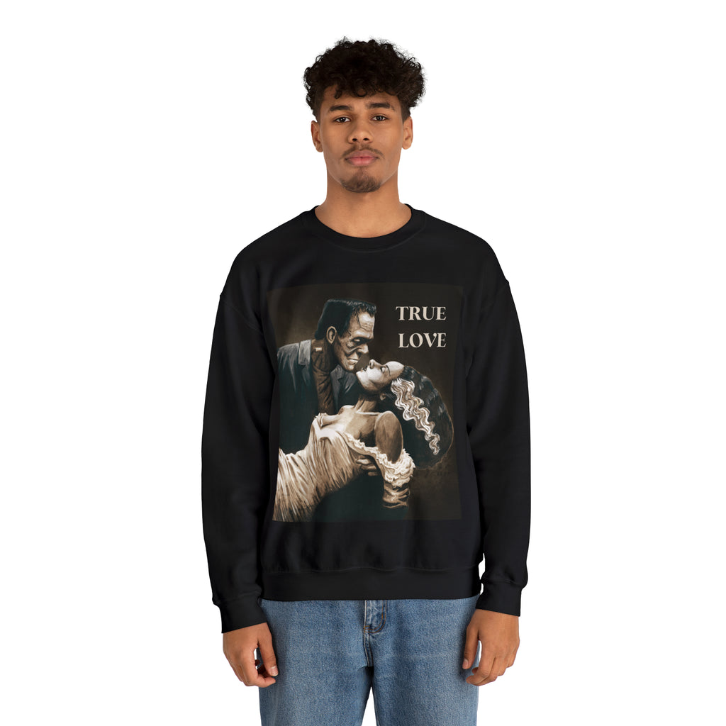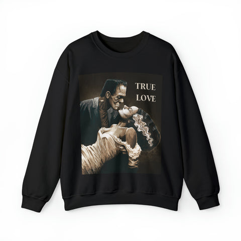 A cozy sweatshirt showcasing Frankenstein and his Bride in a loving romantic embrace.