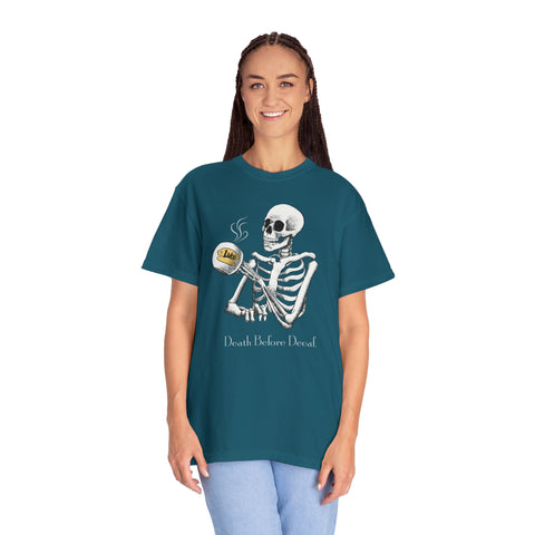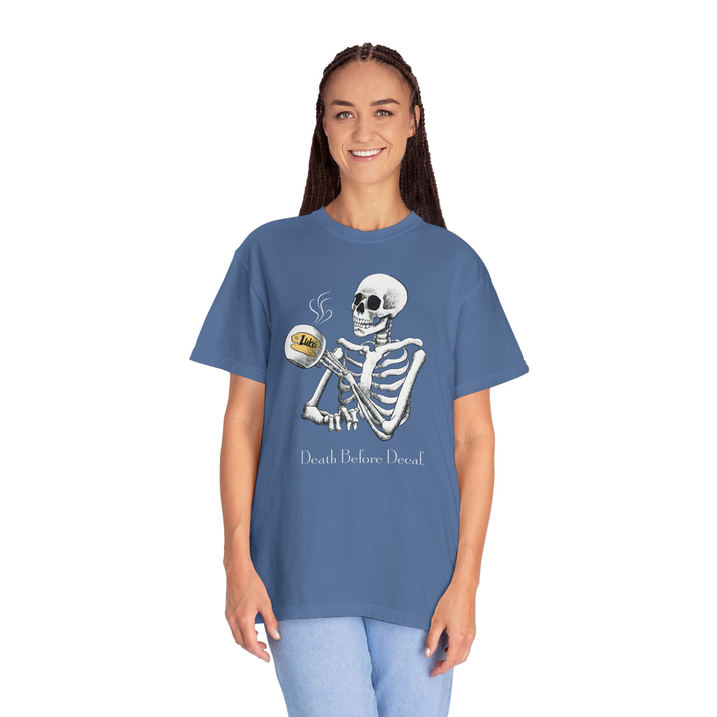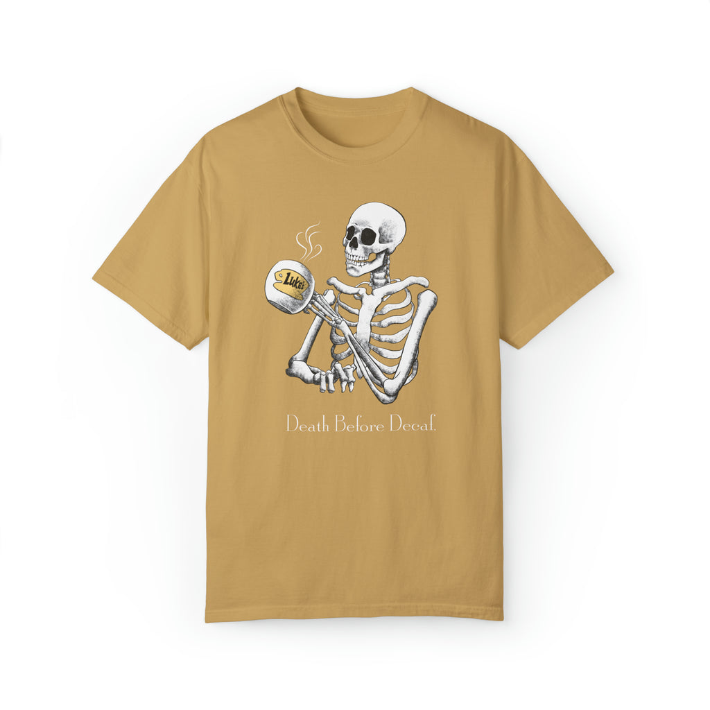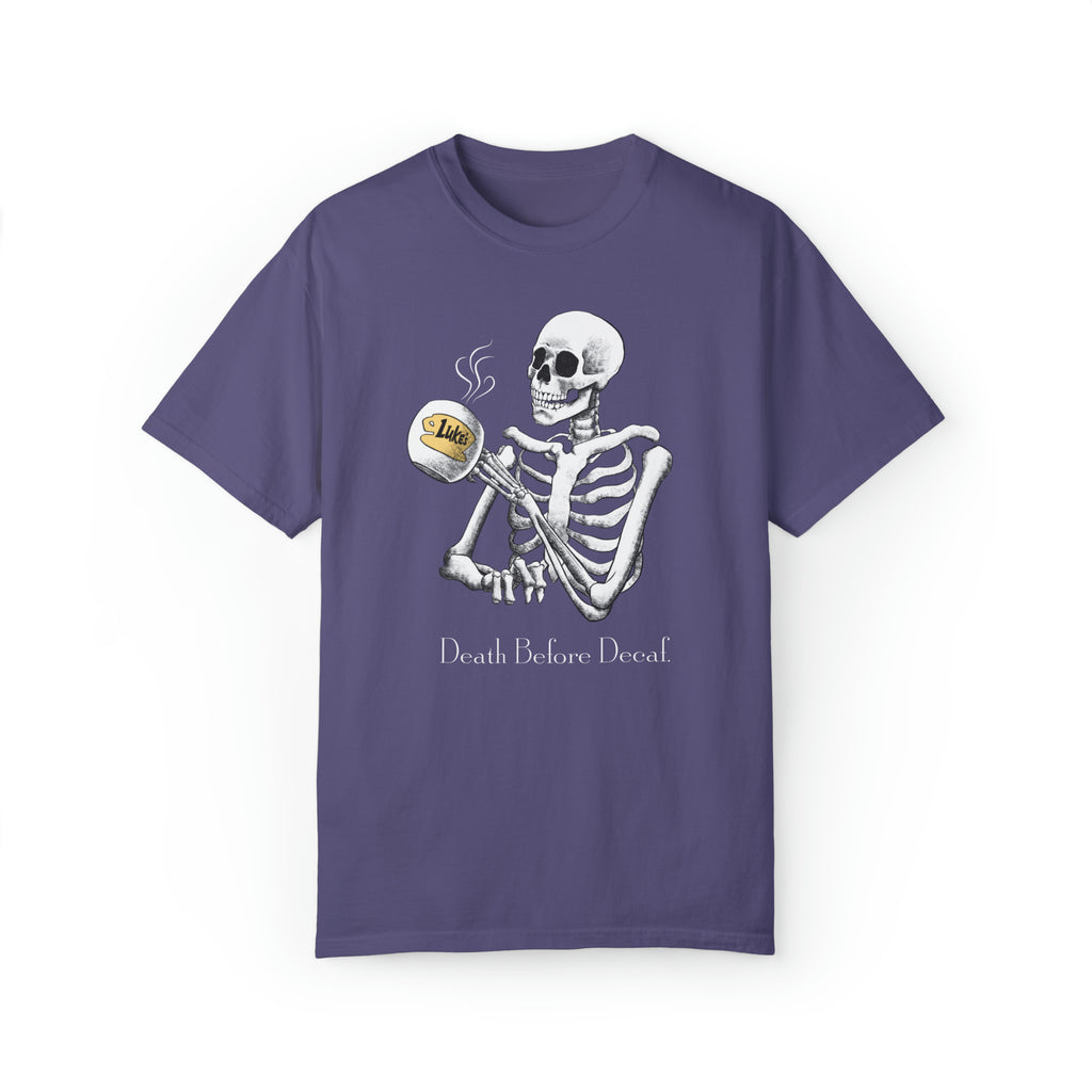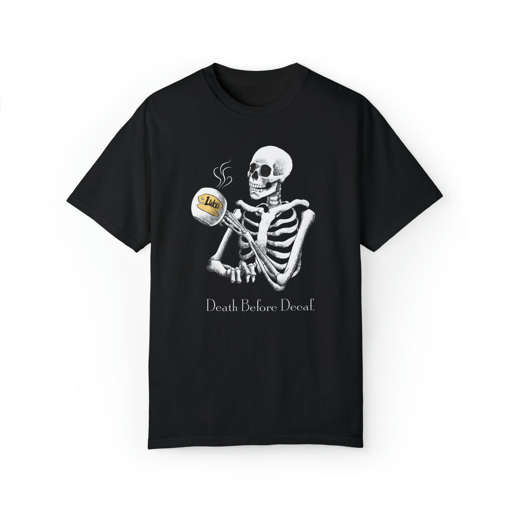 Gilmore Girls meets Halloween on this cozy tee, featuring a Skeleton drinking from a Luke"s diner coffee mug. With the quote "Death Before Decaf in the recognizable Gilmore Girls font.